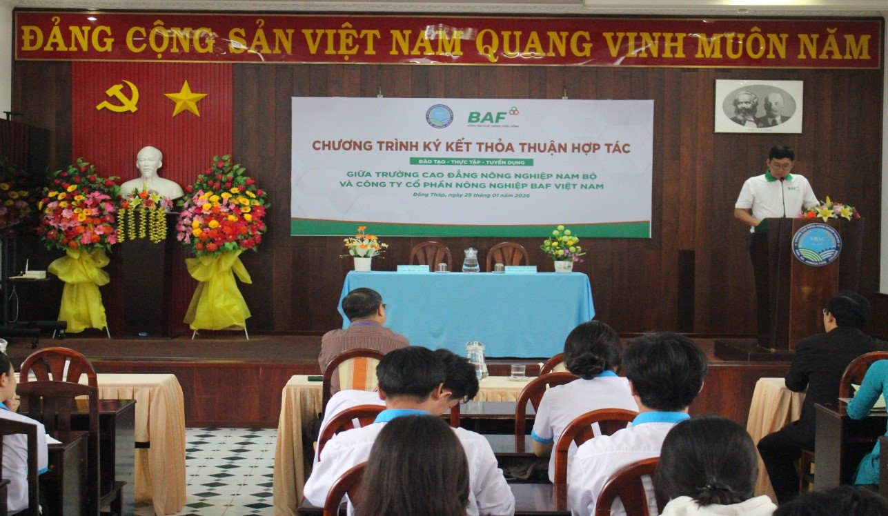 Chiều ngày 29 tháng 01 năm 2026, Trường Cao đẳng Nông nghiệp Nam Bộ tổ chức Chương trình trao biên bản ký kết thỏa thuận hợp tác với Công ty Cổ phần Nông nghiệp BAF Việt Nam và tọa đàm về đào tạo - việc làm ngành thú y.
