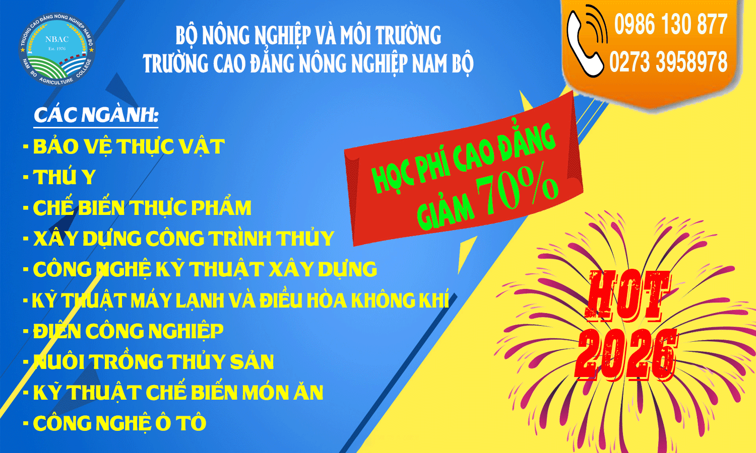 Năm 2026, Trường Cao đẳng Nông nghiệp Nam Bộ tổ chức xét tuyển 100% chỉ tiêu căn cứ vào bằng tốt nghiệp THPT cho tất cả các ngành đào tạo Cao đẳng và tổ chức xét tuyển 100% chỉ tiêu căn cứ vào bằng tốt nghiệp THCS trở lên hoặc tương đương cho tất cả các ngành đào tạo Trung cấp.
