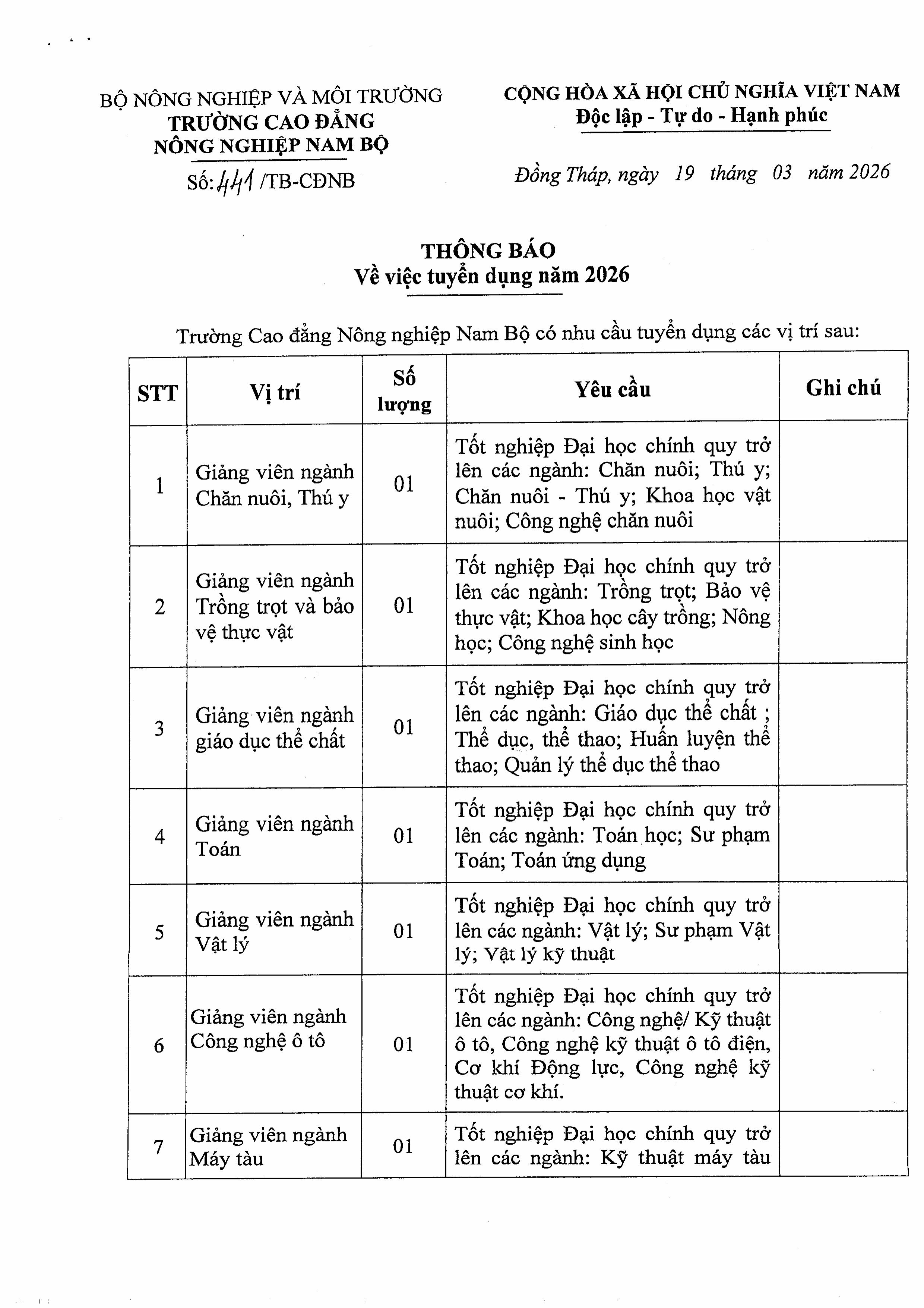 THÔNG BÁO TUYỂN DỤNG NĂM 2026